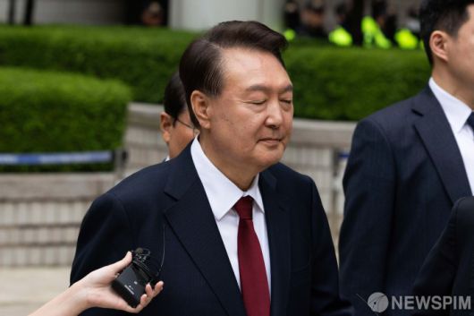 [서울=뉴스핌] 사진공동취재단 = 윤석열 전 대통령이 19일 정오 서울 서초구 중앙지방법원에서 열린 내란 우두머리 혐의, 직권남용 권리행사방해 혐의 사건 4차 공판의 오전 재판 종료 후 점심 식사를 위해 법정을 빠져 나가고 있다. 2025.05.19 photo@newspim.com |
