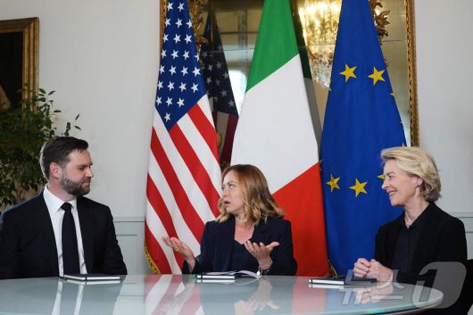 (로마 AFP=뉴스1) 정지윤 기자 = (왼쪽부터) JD 밴스 미국 부통령, 조르자 멜로니 이탈리아 총리, 우르줄라 폰데어라이엔 EU 집행위원장이 이탈리아 로마에 모여 대화하고 있다. 2025.05.18 ⓒ AFP=뉴스1 Copyright ⓒ 뉴스1. All rights reserved. 무단 전재 및 재배포, AI학습 이용 금지.