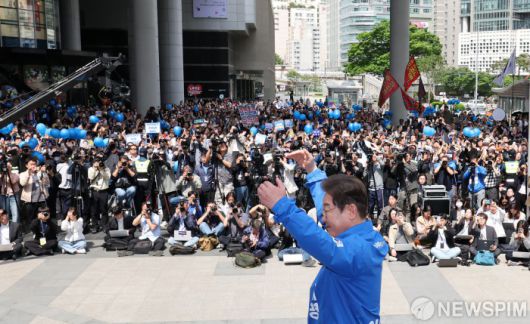 [서울=뉴스핌] 윤창빈 기자 = 이재명 더불어민주당 대선후보가 19일 서울 용산역 광장에서 열린 유세에 입장하며 손을 들고 인사하고 있다. 2025.05.19 pangbin@newspim.com |