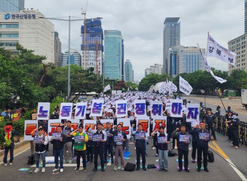 전국민주노동조합총연맹(민주노총)은 19일 오후 서울 여의도 국회 인근에서 '특수고용·플랫폼 노동자 노동기본권 쟁취! 민주노총 결의대회'를 열고 특수고용·플랫폼 노동자에 대해 근로기준법 개정, 사회보험 확대 적용 등을 대선 후보들에게 요구했다. 이날 집회에서는 주최 측 추산으로 노총 관계자와 특수고용·플랫폼 노동자 5000여명이 모였다.