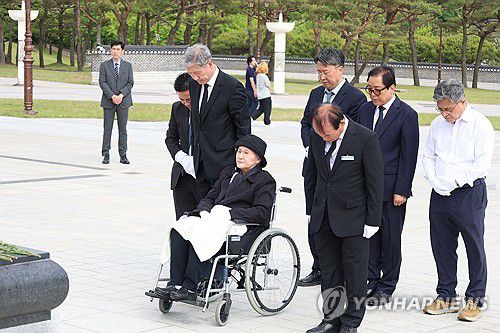 (광주=연합뉴스) 5·18민주화운동 45주년 하루 뒤인 19일 노태우 전 대통령의 배우자인 김옥숙 여사가 아들 노재헌씨와 함께 광주 북구 운정동 국립5·18민주묘지를 찾아 참배하고 있다. 2025.5.19 [국립5·18민주묘지 제공. 재판매 및 DB 금지]