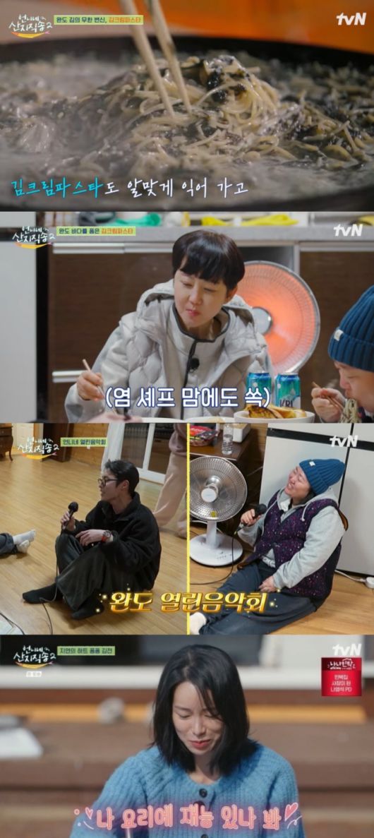 지난 18일 방송된 tvN 예능 ‘언니네 산지직송2’ 6회에서는 곡소리 나는 김 28톤 하역 작업을 끝낸 뒤 완도 제철 한 상을 차려내는 염정아, 박준면, 임지연, 이재욱의 이야기가 그려졌다.