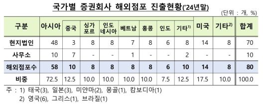 지난해 말 기준 현지법인의 자산 총계는 342억8000만달러(약 50조4000억원)로 전년 대비 9.7% 줄었으며, 전체 증권사 자산총계의 8.9%에 해당한다. 자기자본은 81억4000만달러(약 12조원)로 전체 자기자본의 18.5% 수준이었다.