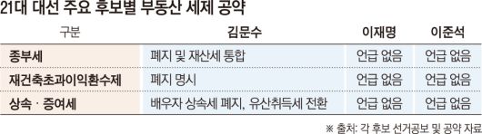 하지만 이재명 후보와 이준석 후보는 상속세와 증여세에 대한 구체적인 조정 방안을 언급하지 않았다. 주택 공급과 규제 완화에 방점을 찍었지만 상속과 증여를 통한 자산 이전의 원활화에 대해서는 정책적 대안이 부재한 상황이다.