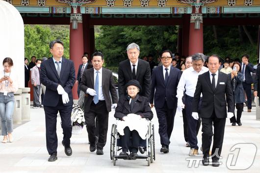 노태우 전 대통령의 아내 김옥숙씨가 19일 광주 북구 운정동 국립 5·18민주묘지를 방문, 아들 노재헌 씨가 미는 휠체어에 앉아 이동하고 있다. 2025.5.19/뉴스1 ⓒ News1 이수민 기자 |