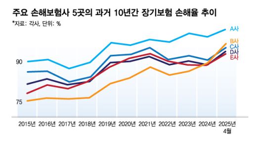 19일 금융권에 따르면 지난 2015년~올해 4월까지 손해보험사 상위 5개사의 장기보험 손해율 패턴을 분석한 결과 지난 10년간 모든 손보사의 손해율이 우상향의 상승곡선을 그리는 것으로 확인됐다. 손해율이란 보험사가 그해 계약자에게 받은 위험보험료를 지급 보험금으로 나눈 수치를 말한다. 손해율이 높으면 보험사 실적에는 부담이 된다. 코로나19가 이후 병원 이용률이 줄어 일부 구간 손해율이 일시 하락했으나 과거 5년, 10년 추세는 모든 보험사가 비슷하게 올라갔다.