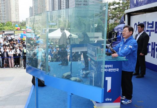 유세 현장에서 눈길을 끈 것은 단연 이 후보의 저격 위협을 차단하기 위해 마련된 방탄유리막이었다. 방탄 유리막은 이동식으로 제작돼 유세 현장마다 등장할 예정이다.
