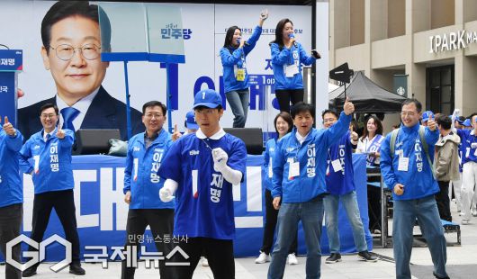 (서울=국제뉴스) 더불어민주당에 입당한 김상욱 의원이 19일 서울 용산구 용산역 광장에서 열린 이재명 더불어민주당 대선 후보의 집중유세에서 유세활동을 하고 있다./사진=이용우 기자