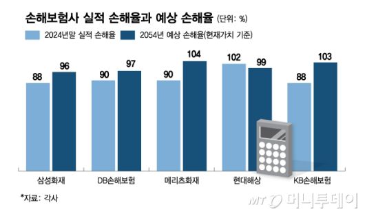 장기보험 예상 손해율을 어떻게 가정하냐에 따라 보험사 손익은 크게 달라진다. 지난해 말 기준 삼성화재, DB손해보험, 메리츠화재, 현대해상, KB손해보험의 실적 손해율은 88%, 90%, 90%, 102%, 88%였다. 그런데 30년 뒤 예상 손해율(현재가치 환산)은 96%, 97%, 104%, 99%, 103%로 공시했다. 지난해 대비 예상 손해율이 최대 15%포인트(P) 오른다고 가정한 회사도 있고 반대로 3%포인트 하락한다고 가정한 회사도 있다.