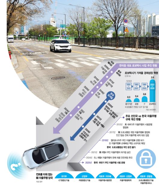 미국 연방교통부가 2016년 인공지능(AI) 자율주행컴퓨터를 운전자로 인정하고 2018년 중국은 법제를 정비해 포니.AI가 로보택시를 운행하기 시작했다. 2021년에는 독일이 무인 자율주행차 허가법, 일본도 무인 자율주행을 위해 도로교통법을 제정했지만 한국은 아직도 법 규제를 고수하고 있다.