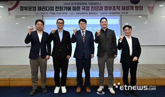 한국행정학회와 전자신문이 공동주최한 2025 한국행정학회 기획세미나가 '정부운영 패러다임 전환기에 따른 국정 진단과 정부조직 재설계 방향'을 주제로 19일 서울 중구 대한상공회의소에서 열렸다. 왼쪽부터 은종환 경상국립대 교수, 이정욱 연세대 교수, 정광호 한국행정학회장, 이수기 한국행정학회 대외협력위원장, 허형조 단국대 교수. 이동근기자 foto@etnews.com |