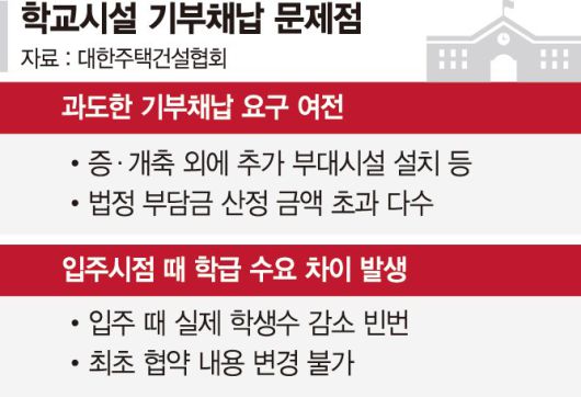 협회 한 관계자는 "분쟁 소지가 없도록 기부채납 기준을 조속히 마련해야 한다"며 "또 입주 시점의 학령인구 변화를 반영해 기부채납 수준을 조정할 수 있도록 법적 근거도 마련해야 한다"고 강조했다.