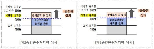 건축허가·신고 대상이 지구단위계획구역에 해당하면 기존 계획을 일괄 재정비 후 용적률 완화가 적용이 가능하고, 제2·3종일반주거지역 허용 용적률에서 50%를 추가로 적용할 수 있도록 할 계획이다.