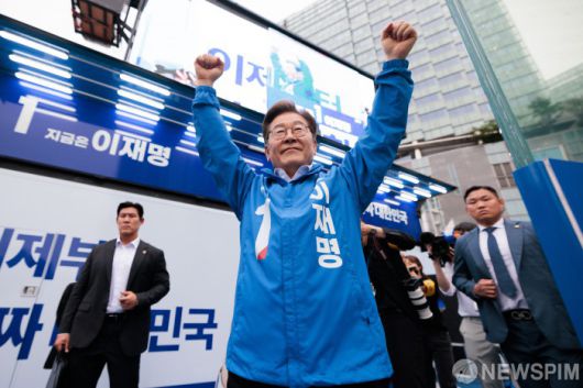 [서울=뉴스핌] 윤창빈 기자 = 이재명 더불어민주당 대선 후보가 19일 오후 서울 영등포구 타임스퀘어 앞에서 열린 유세에서 지지를 호소하고 있다. 2025.05.19 pangbin@newspim.com