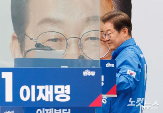 이재명 더불어민주당 대선 후보가 19일 오후 서울 영등포구 타임스퀘어 앞에서 열린 유세에서 방탄유리가 설치된 발언대로 향하고 있다. 윤창원 기자 |