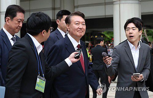 (서울=연합뉴스) 윤석열 전 대통령이 19일 서울 서초구 서울중앙지방법원에서 열린 내란 우두머리 혐의, 직권남용 권리행사방해 혐의 사건 4차 공판을 마친 후 취재진의 질문을 받으며 법정을 나서고 있다. 2025.5.19 [사진공동취재단]
