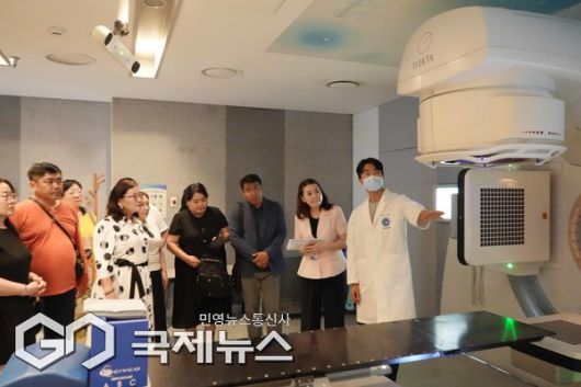 몽골 바가항가이구 공무원 연수단이 방사선종양학과를 둘러보고 있다/제공=동남권원자력의학원 |