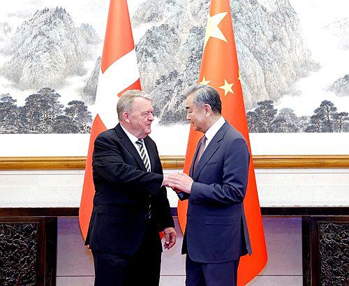 19일 중국 외교부에 따르면 왕이 중국공산당 중앙외사판공실 주임(외교부장 겸임)은 이날 베이징을 방문 중인 라르스 뢰케 라스무센 덴마크 외무장관을 만나 "덴마크가 하반기에 유럽연합(EU) 순회의장국을 맡게 되는데, 중국은 EU와 대화·협력을 강화해 양자 관계의 건강한 발전을 함께 추동할 용의가 있다"며 "덴마크가 이를 위해 적극적인 역할을 발휘해주기를 희망한다"고 말했다. 사진은 . 2025.5.19 [중국 외교부 제공. 재판매 및 DB 금지]