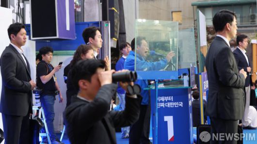[서울=뉴스핌] 윤창빈 기자 = 이재명 더불어민주당 대선 후보가 19일 서울 마포구 어울마당로에서 방탄유리가 설치된 유세차량 위에 올라 연설하고 있다. 2025.5.19 pangbin@newspim.com