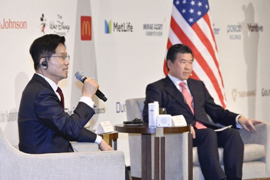 김문수 국민의힘 대통령 후보가 19일 서울 종로구 포시즌스호텔에서 열린 주한미국상공회의소(암참) 간담회애서 발언하고 있다. 공동취재사진