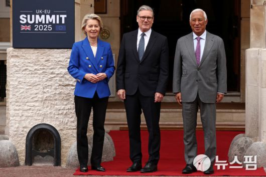 [런던 로이터=뉴스핌] 장일현 특파원 = 우르줄라 폰데어라이엔 유럽연합(EU) 집행위원장과 키어 스타머 영국 총리, 안토니오 코스타 EU 정상회의 상임의장이 19일(현지시간) 영국 런던 랭카스터 하우스에서 열린 정상회담에 앞서 취재진을 향해 포즈를 취하고 있다. 2025.05.19 ihjang67@newspim.com |