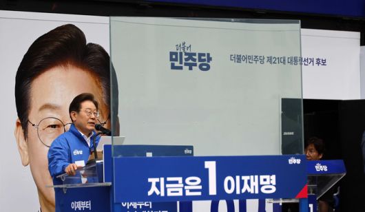 이재명 더불어민주당 대선후보가 19일 서울 영등포구 타임스퀘어에서 열린 유세에서 연설을 하고 있다. 이 후보의 유세 차량 연단에는 이날부터 3면에 걸쳐 방탄 유리막이 설치됐다. 2025.5.19 [김호영 기자] |