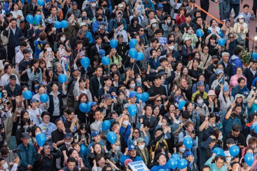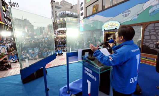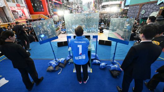 이 후보는 이날 용산역 광장과 영등포구 타임스퀘어에 이어 마포구 홍대에서도 방탄 유리막이 설치된 연단에서 유세했다. 홍대에서는 유리 벽이 이 후보를 삼중으로 에워쌌다. 이 후보가 연설 초반 유리 벽을 벗어나 말을 하자 지지자들이 “유리 안으로 들어가라”며 소리치기도 했다. 현장에서 만난 민주당 당원 김정은(44)씨는 “근처에 살아서 회사를 퇴근하고 이재명을 보러 왔다. 파란 풍선도 구입했다”며 “제 주변 3040 또래들은 모두 이재명을 지지한다”고 했다.