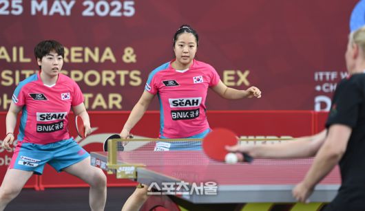 신유빈(오른쪽), 유한나가 19일 카타르 도하 카타르대학교 스포츠 컴플렉스에서 열린 2025 국제탁구연맹(ITTF) 세계선수권대회 여자복식 32강 조르지나 포타(헝가리), 드 누트(룩셈부르크) 조와 경기를 펼치고 있다. 2025. 5. 19. 도하(카타르) | 최승섭기자 thunder@sportsseoul.com