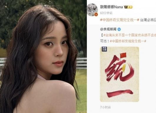 대만의 첼리스트 겸 배우 오우양나나(왼쪽)가 지난해 5월 자신의 중국 소셜미디어(SNS)웨이보에 “대만의 독립은 죽음의 길”이라는 글과 ‘통일’이라는 한자에 중국의 오성홍기를 꽂고 대만 영토를 새긴 중국 관영 중국중앙통신의 게시물을 ‘리트윗’했다. 자료 : 오우양나나 인스타그램·웨이보 |