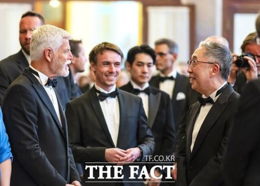 체코 ‘프라하의 봄 국제음악제’에 참석한 두산에너빌리티 박지원 회장(사진 오른쪽)이 12일(현지시간) 체코 프라하에서 열린 개막공연 리셉션에서 페트르 파벨 체코 대통령(사진 왼쪽)과 만나 환담을 나누고 있다. /두산에너빌리티 |