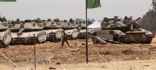이스라엘군 탱크들이 18일 이스라엘 남부 가자지구 국경 근처에 가자 진격을 위해 집결해 있다. /UPI 연합뉴스 |