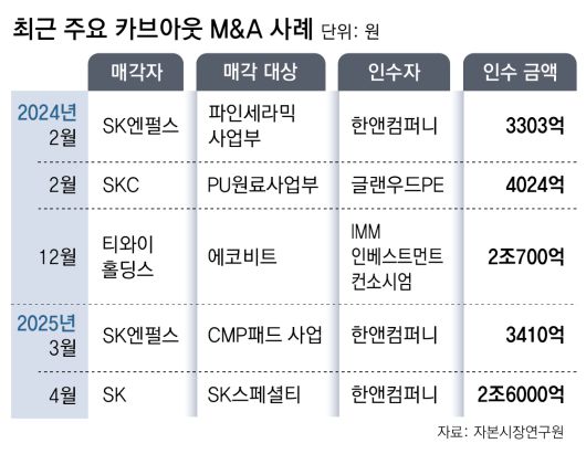 특히 SK그룹은 지난해부터 다수의 자회사를 매각하면서 카브아웃 거래를 주도하고 있다. 지난해 2월 SK엔펄스의 반도체 소재 사업부인 파인세라믹 사업(현 솔믹스)을 한앤컴퍼니에 매각했고, SKC의 화학 소재 사업부인 PU원료사업부(현 피유코어)를 글랜우드PE에 팔았다. SK렌터카도 지난해 해외 PEF인 어피니티에퀴티파트너스에 넘겼다. 올해도 SK엔펄스의 반도체 소재 사업부인 CMP패드 사업과 특수가스업체 SK스페셜티를 한앤컴퍼니에 매각했다. 이 외에도 태양광업체인 SK실트론과 SK에코플랜트의 폐기물·수처리 사업 매각도 추진 중이다.