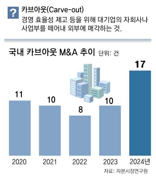 대기업의 사업부를 떼어내서 외부에 매각하는 ‘카브아웃(Carve-out)’ 딜이 급증하며 국내 인수합병(M&A) 시장에서 대세로 자리매김하고 있다. 비핵심 자산을 팔아 핵심 사업에 집중하려는 대기업의 전략과 대기업 소속의 검증된 자산을 인수하려는 사모펀드(PEF)의 이해관계가 맞아떨어진 영향으로 풀이된다.