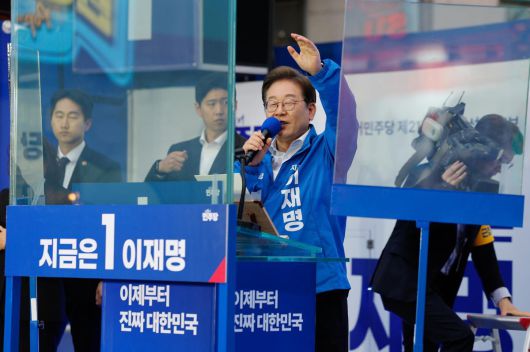 더불어민주당 이재명 대선 후보가 19일 3면 ‘방탄 유리막’으로 둘러싸인 연단에서 유세했다. 국내 대선 후보가 테러 위협 때문에 유세차 위에 방탄 유리막을 설치한 건 처음이다.