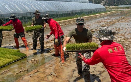19일 경북 포항시 남구 오천읍의 한 농가에서 해병대 1사단 대원들과 주한 미국 해병대 캠프 장병들이 힘을 합쳐 모내기에 사용할 모판 옮기기 작업을 돕고 있다. 뉴스1 Copyright Ⓒ 동아일보. All rights reserved. 무단 전재, 재배포 및 AI학습 이용 금지