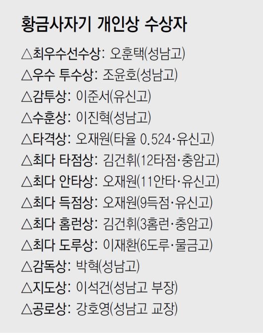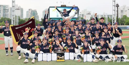 이날 경기장을 찾은 성남고 재학생과 동문들은 우승 뒤 그라운드 위의 선수들과 함께 교가를 부르며 55년 만의 황금사자기 우승을 자축했다. SSG 투수 노경은(41) 등 성남고 출신 선수들과, 같은 재단의 성남중 선수들도 경기장을 찾아 열띤 응원을 보냈다. 이날 5타수 3안타 3타점으로 맹활약한 이서준은 “55년 만의 우승이 믿기지 않는다. 야구부 친구, 후배들과 성남고를 빛낼 수 있어 기쁘다”고 말했다.