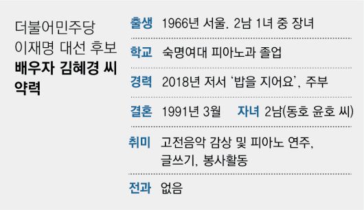 민주당 이재명 대선 후보의 배우자 김혜경 씨는 2006년 이 후보의 성남시장 출마 시절부터 이처럼 남편의 정치권 진출을 만류했다고 한다. 한때 이 후보의 정계 진출을 반대했던 김 여사는 이 후보가 성남시장에 당선된 뒤론 종교계 등 사회 각층의 목소리를 이 후보에게 전달하는 정치적 동반자 역할을 하고 있다는 평가를 받는다.