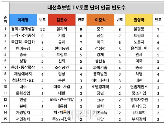 이재명 후보는 '경제·경제성장'을 12회, '국익'을 8회, '한미동맹'을 7회, '중국'을 6회 언급, 경제 활성화를 최우선 과제로 설정하는 한편 실리주의적 외교 노선을 강조하며 중도 실용주의 이미지를 구축하는 데 주력한 것으로 평가됐다. 또 '재생에너지', '첨단산업·AI', '문화산업' 등 신성장 산업 육성 비전을 제시하며 경제 전문성 이미지를 내세운 것으로 평가됐다.