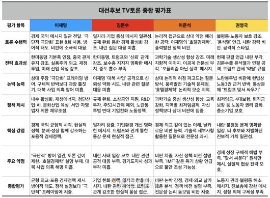 AI는 권 후보가 불평등 해소 문제에 대한 입장을 명확히 제시했으나 실질적 협상 전략은 모호하다고 봤다. 권 후보가 내란·불평등 문제에 명확한 입장을 낸 점은 강점으로, 경제 성장의 구체적 해법 부재와 투쟁적 이미지로 중도층 설득에 제한적인 점은 약점이라고 봤다.