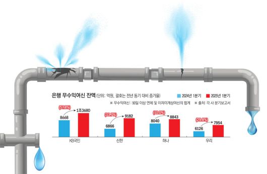 은행별로는 KB국민은행의 무수익여신이 1조3680억 원으로 가장 많다. 이어 신한은행(9181억 원)·하나은행(8843억 원)·우리은행(7954억 원) 순으로 집계됐다. 1년 새 증가 폭은 국민 57.8%, 신한 33.7%, 우리 29.8%, 하나 10%로 나타났다.