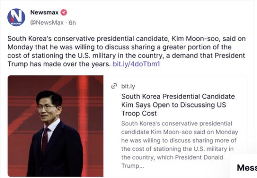 미국의 대표적인 친(親)트럼프 매체로 분류되는 뉴스맥스가 19일(현지시간) 국민의힘 김문수 대선후보가 전날 ″주한미군 주둔 비용 인상″ 가능성을 시사한 발언을 비중 있게 보도했다. 뉴스맥스 SNS |