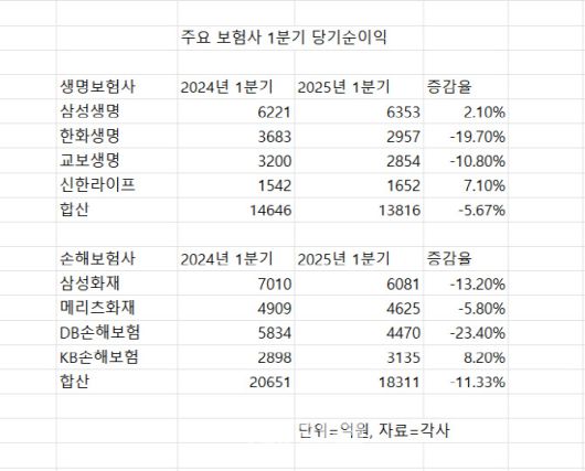 20일 금융권에 따르면 삼성·한화·교보생명·신한라이프 등 4개 생명보험사의 올 1분기 당기순이익은 1조 3816억원, 삼성·메리츠화재·DB·KB손해보험 등 4개 손해보험사는 1조 8311억원으로 지난해 같은 기간보다 각각 5.67%, 11.33% 감소했다.