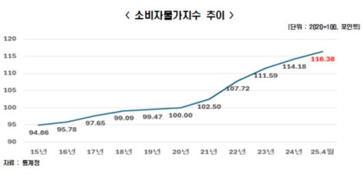 실제로 소비자물가지수가 개편된 2020년(지수=100)을 4년여 전후한 기간을 비교해보면, 직전 4년인 2016년(95.78)에서 2020년(100)까지 물가상승률은 4.4%였지만 2020년(100)부터 2025년 4월(116.38)까지는 16.4% 상승했다.
