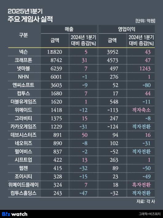 비즈워치가 18개 주요 게임사(넥슨·크래프톤·넷마블·NHN·엔씨소프트·컴투스·더블유게임즈·위메이드·그라비티·카카오게임즈·데브시스터즈·네오위즈·펄어비스·시프트업·웹젠·조이시티·위메이드플레이·컴투스홀딩스)의 1분기 실적을 집계한 결과 8곳(넥슨·크래프톤·넷마블·컴투스·더블유게임즈·그라비티·데브시스터즈·시프트업·위메이드플레이)은 매출이 전년동기대비 성장했다. 영업이익이 전년대비 증가한 곳도 8곳(넥슨·크래프톤·넷마블·NHN·컴투스·데브시스터즈·시프트업·위메이드플레이)으로 나타났다.