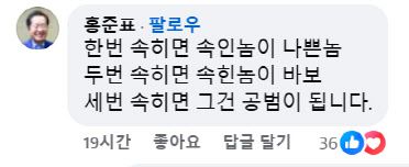 홍 전 시장은 지난 19일 오전 페이스북 프로필 사진을 파란 정장과 넥타이를 착용한 사진으로 변경했을 무렵 한 지지자의 페이스북 글에 이같이 댓글을 남겼다.
