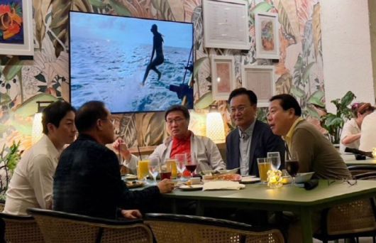 국민의힘 대선 선대위 유상범 단일화추진본부장, 김대식 대외협력본부장, 조광한 대외협력부본부장, 이성배 선대위 대변인이 19일 홍준표 전 대구시장의 선대위 합류를 설득하기 위해 미국 하와이에서 홍 전 시장을 만나고 있다 (사진=연합뉴스) |