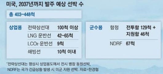 미국이 2037년까지 산업용·군수용 선박을 최대 448척 발주할 것이란 전망이 나왔다. 대략 우리나라 전체 선박건조 3년치에 해당하는 물량으로 정부와 기업이 이 같은 기회를 놓쳐서는 안 된다는 지적이 나온다.