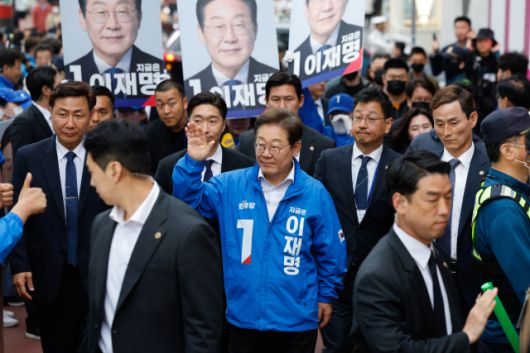 ▲더불어민주당 이재명 대선 후보가 19일 오후 유세를 위해 서울 마포구 홍대 레드로드를 찾아 유세에 앞서 인사하고 있다. ⓒ연합뉴스 |