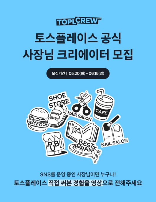[서울=뉴스핌] 송주원 기자 = 모바일 금융앱 토스를 운영하는 비바리퍼블리카(토스)는 결제 단말기 및 포스(POS) 솔루션 공급 자회사 토스플레이스(대표 최재호)가 가맹점주와 함께 하는 '토플크루' 크리에이터 1기를 모집한다고 20일 밝혔다.