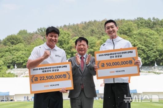대한육상연맹은 "선수들의 사기 진작과 경기력 향상, 지도자 격려를 위해 경기력 향상금 지급 규정을 정립하고 포상금을 지급하고 있다"며 "이에 따라 올해 세계실내육상경기선수권대회에서 금메달을 획득한 높이뛰기 우상혁(용인시청)과 지도자 김도균(용인시청) 코치에게 포상금을 지급했다"고 설명했다.